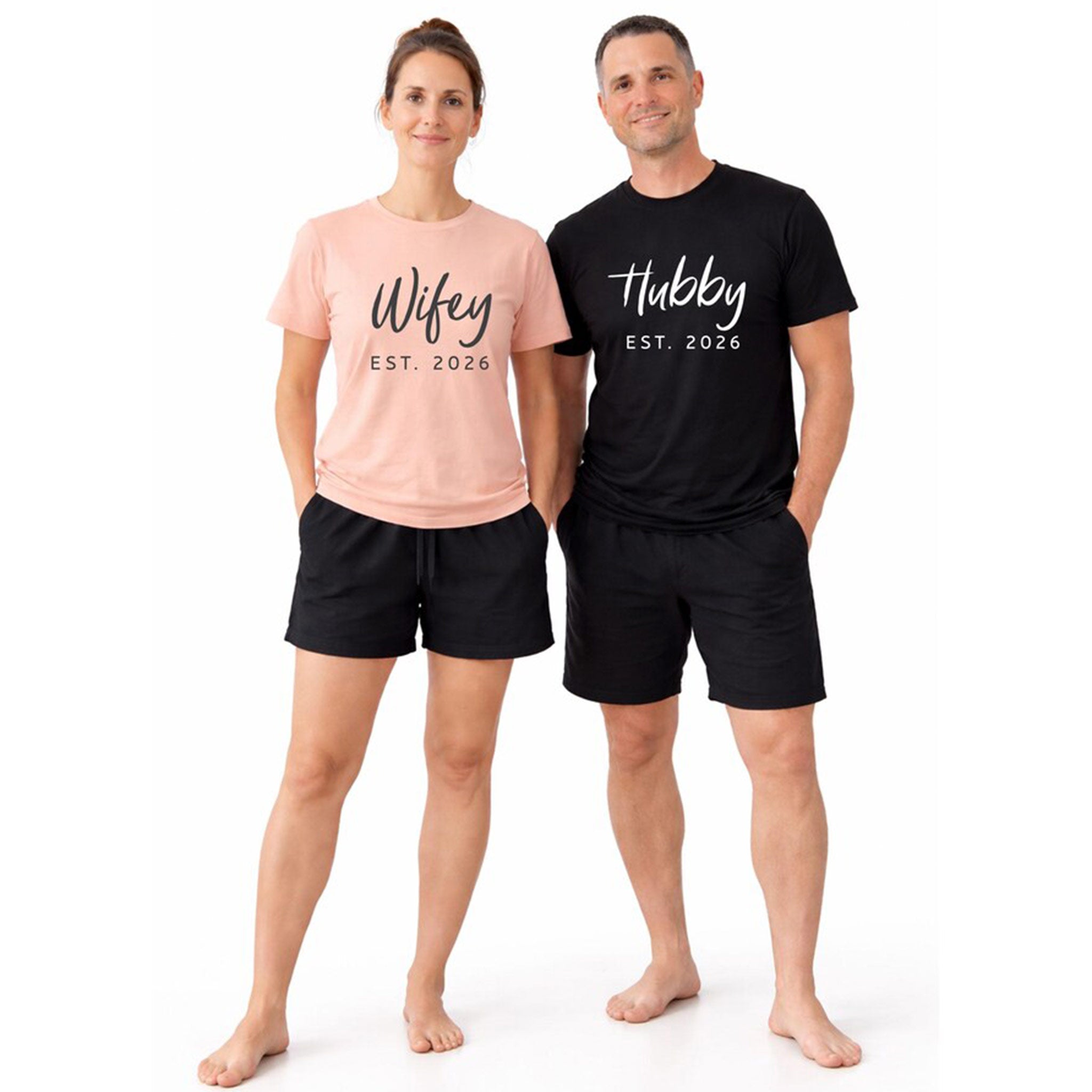 Celebrate love, comfort, and togetherness with our Personalized Hubby & Wifey Matching Pajamas Set, designed for couples who love meaningful details and cozy moments. This matching loungewear set includes short-sleeve t-shirts and comfy boxer shorts for both men and women, making it perfect for relaxing at home, sleepwear, or lounging together in style.