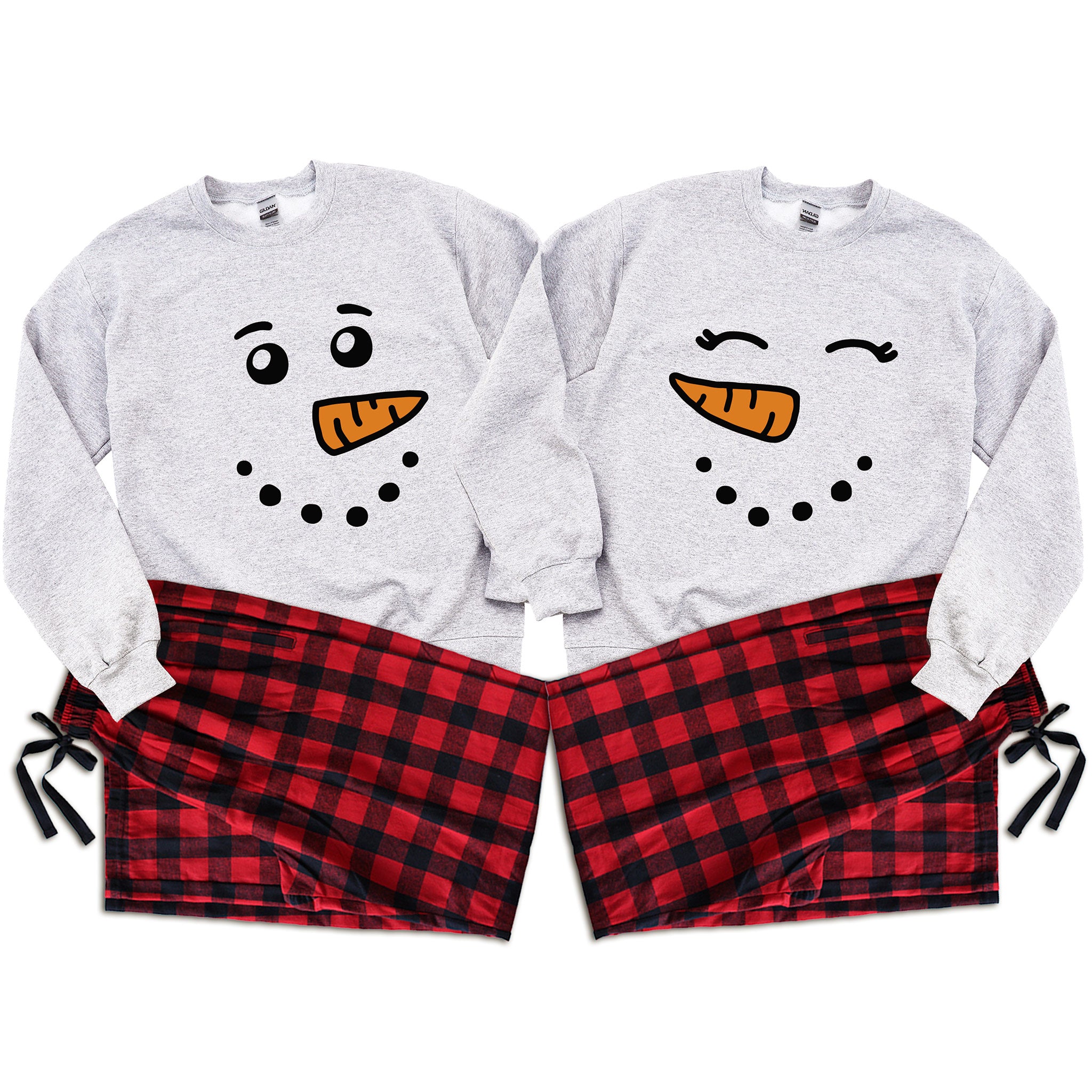Bring holiday cheer to your home with our adorable Snowman & Snowwoman Matching Christmas Sweatshirt and Flannel Pajama Set. Each cozy set includes one soft, quality sweatshirt featuring a festive snowman or snowwoman print, paired with warm, checkered flannel pants for the perfect winter look.