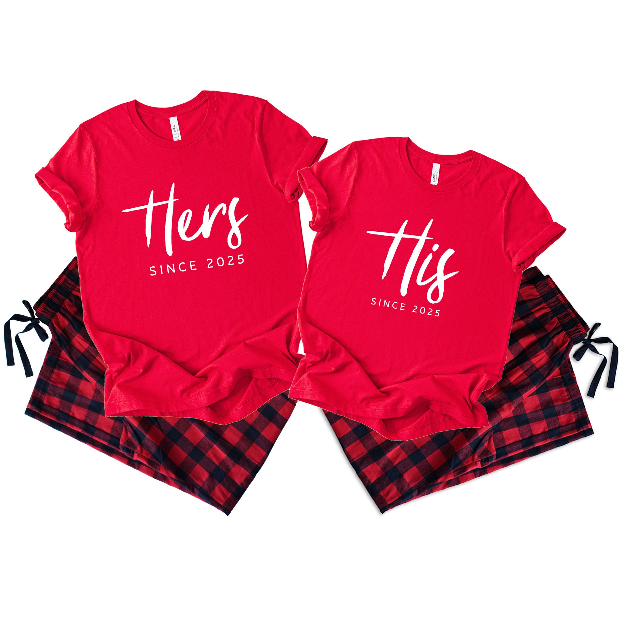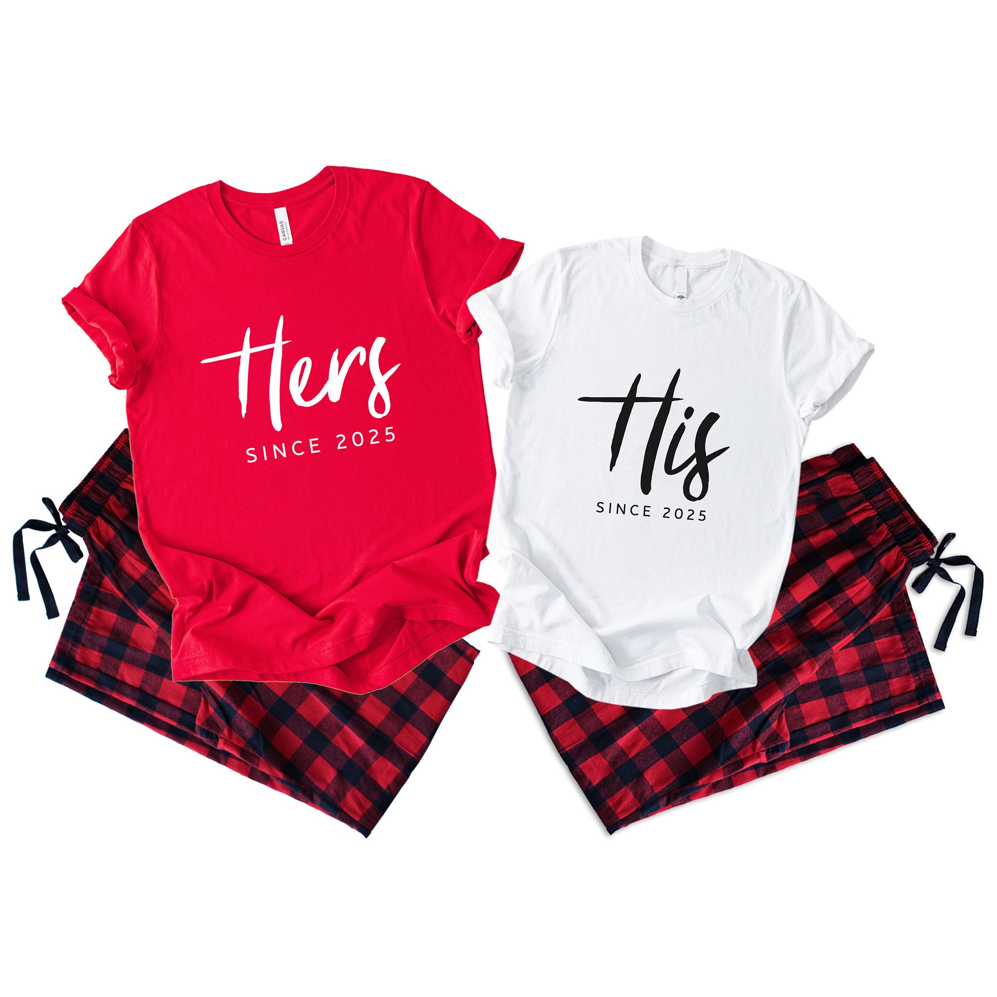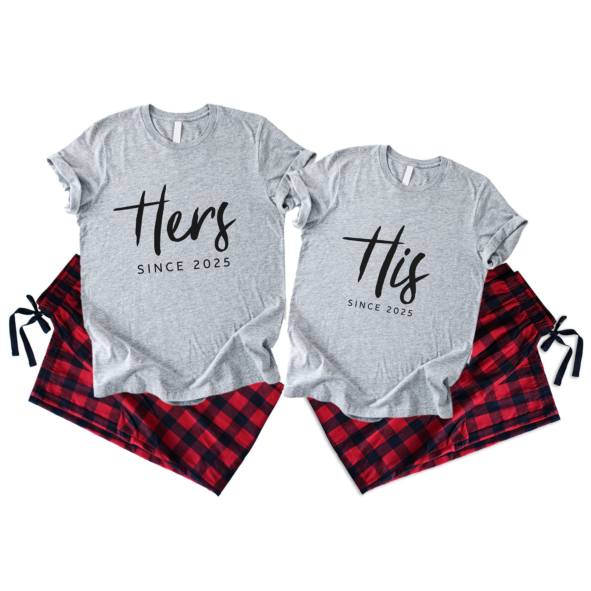 Snuggle up in style with our personalized His & Hers pajama set! Each set includes a soft T-shirt and cozy checkered flannel pants, customized with your special year. Perfect for anniversaries, Valentine’s Day, engagements, or Christmas, these matching pajamas make every night together extra special.