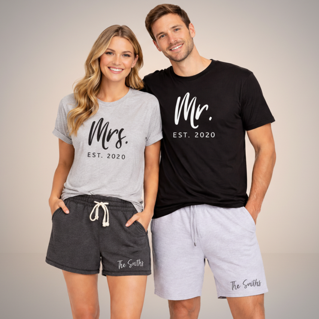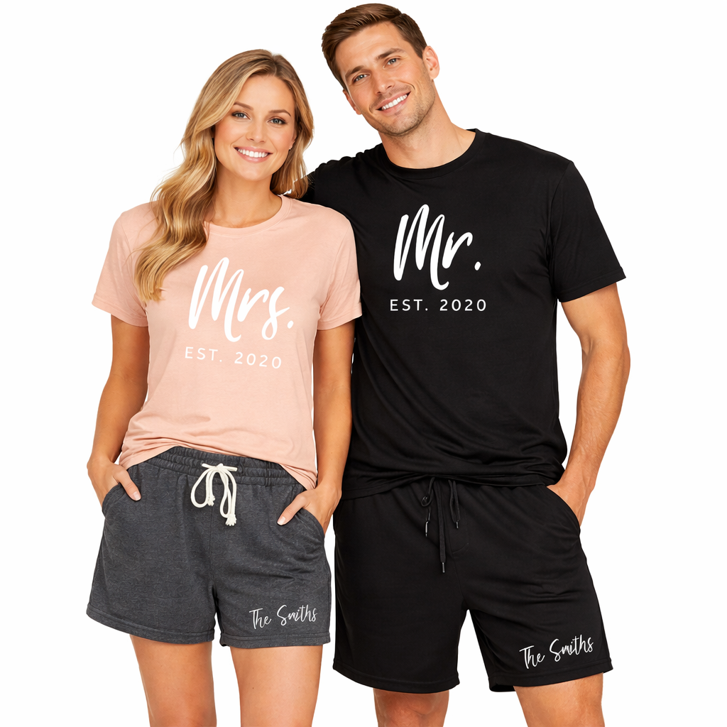 Personalized Mr & Mrs Matching Casual Set for Couples – Custom Est. Year T-Shirts & Family Name Shorts | Anniversary, Wedding & Valentine’s Gift